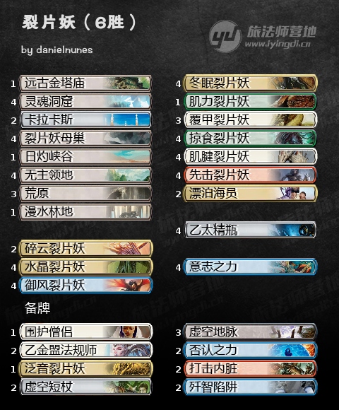 这套裂片妖在周日挑战赛取得了6-2的成绩,操控者是裂片妖大师 danielnunes。套牌使用了3覆甲裂片妖,给所有裂片妖增加1防能躲避病害计划怪的射程,很棒的组法