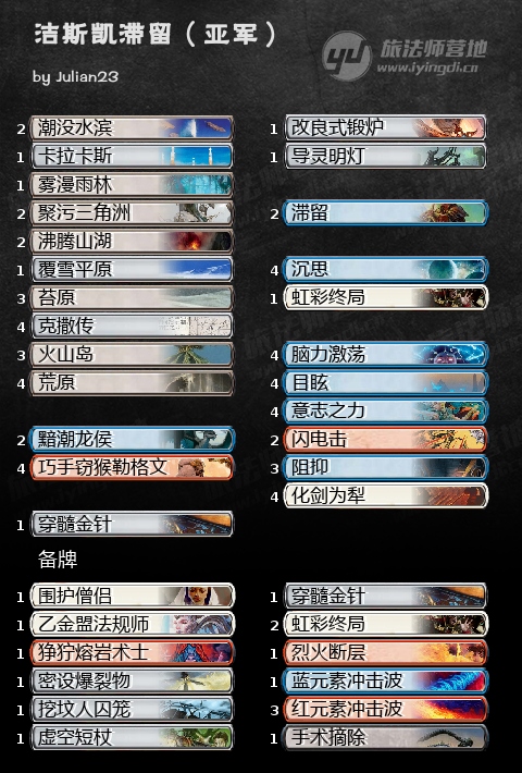 决赛的另一套牌是洁斯凯滞留,是我认为的最强套牌,拥有多维度且可靠的游戏计划来获取胜利。备牌使用了1蓝元素冲击波,是对勒格文、龙怒通念师很好的去除手段