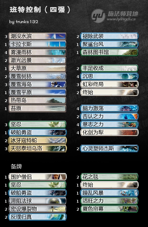 四强还有一套班特控制,是使用了2褪除武装的版本。这张牌与乌洛有很好的配合,也可以暂时抹去勒格文、通念师或对手其他生物的异能,我非常看好这种组法