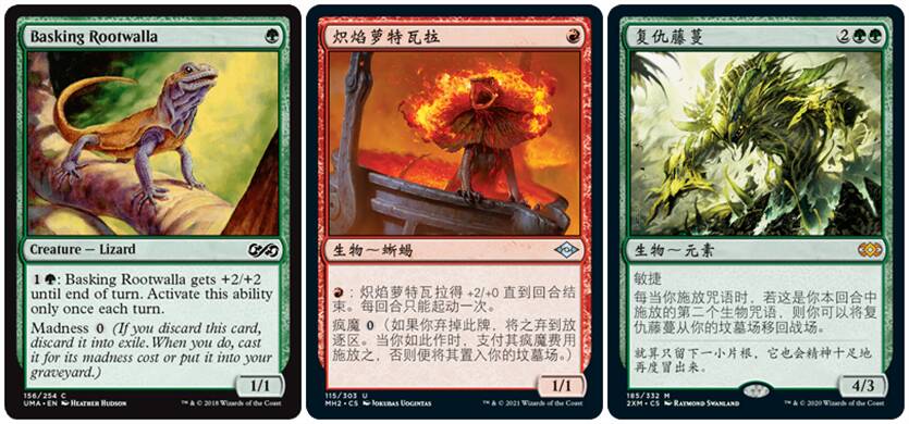 除此以外,套牌里还有8张0费疯魔牌,分别是沐日萝特瓦拉和炽焰萝特瓦拉,它们主要是帮助触发复仇藤蔓的回场,不过也能凭借自身的膨胀效果成为不错的打手
