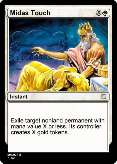 放逐目标法术力值小于等于X的非地永久物。其拥有者获得X个黄金。