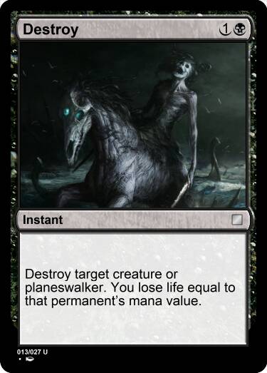 消灭目标生物或者旅法。你失去等同于其法术力值的生命。