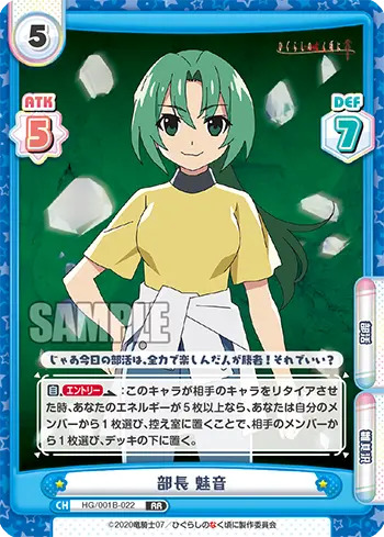【自】【参战区】当该角色将对手的角色置入退场区时,若你的能量卡在5张以上时,你可以选择1个自己的成员区的角色,将其置入休息室,选择一个对手的角色,将其置入卡组底。