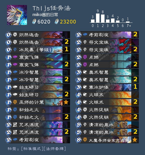 他是全法术带一张安东尼,拉满法术过牌,强度意外地还可以。。快的时候6费就可以下晨拥,一般七八费也能做完。无限点燃直接消除了厚度问题