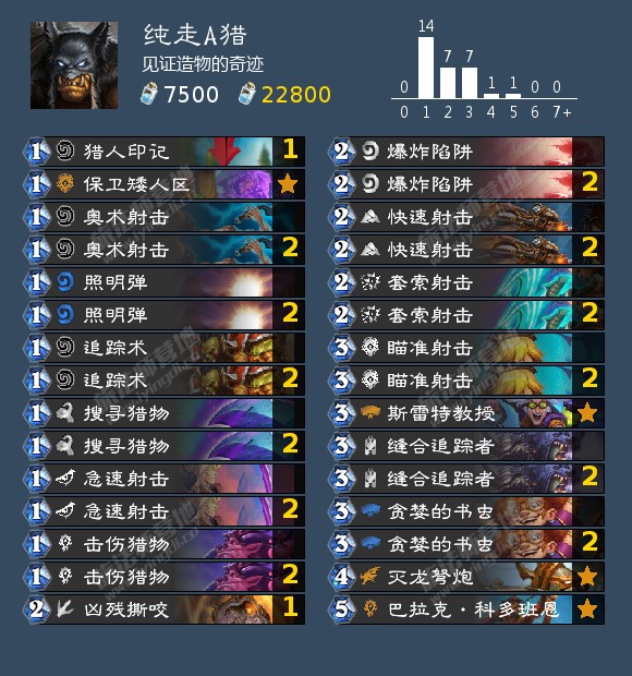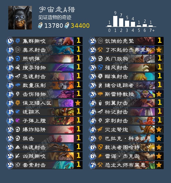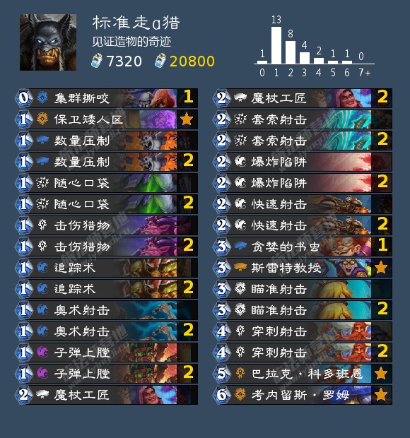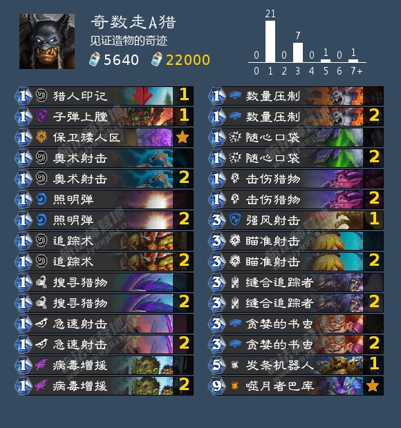 想象一下这个节奏:1费挂任务,2,3费打4个1费法术做任务,3,4,5费用0费的打3射箭解场,足以解掉鱼人萨,奥秘法等快攻的场面。5费打出577,6费就可以射出3箭,然后书虫或缝合追踪者找书虫,补充手牌。7费再射出3箭,或者配合发条机器人直接打出18点斩杀。这样的奇数猎,技能解场完全不虚快攻(奇数骑除外),面对奇迹法,黑眼术之类的组合技卡组可以6费抢死,面对宇宙卡组也只输一手6费准时雷诺·杰克逊再回手。