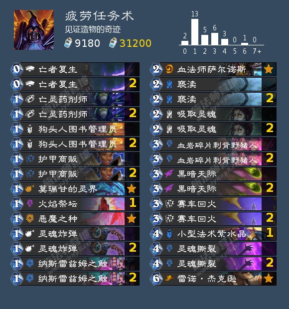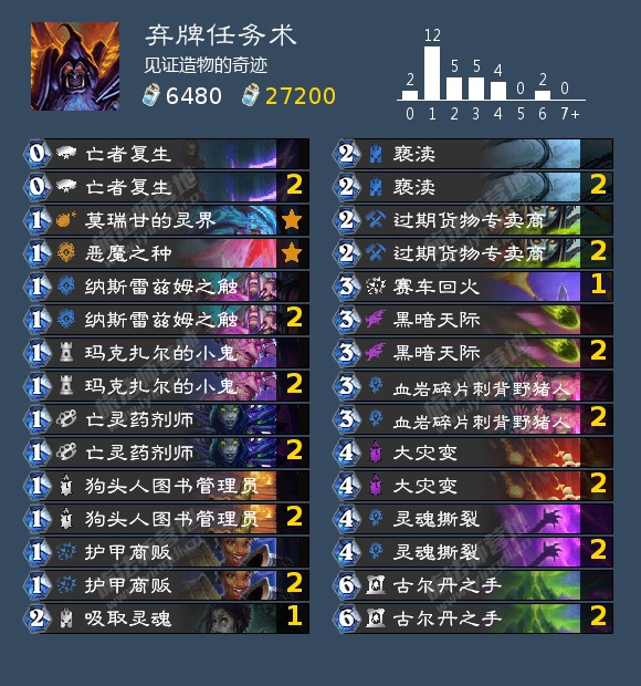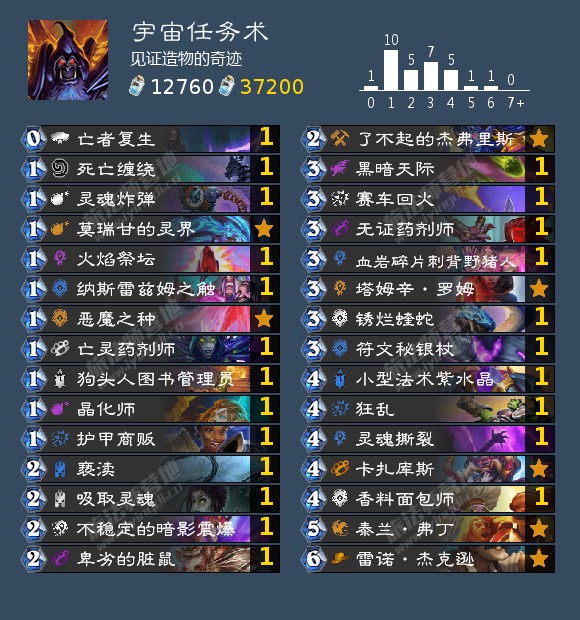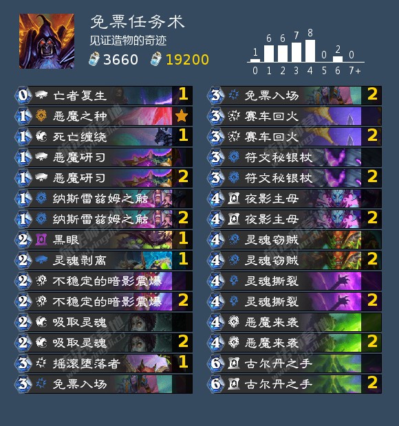 这套免票任务术,和主播试玩用的免票任务术略有不同。核心也是靠灵魂窃贼快速做完任务,直接斩杀。免票入场和符文秘银杖都可以让灵魂窃贼提前启动。这种术士面对打脸卡组可能毫无还手之力,能不能玩取决于新版本的环境。