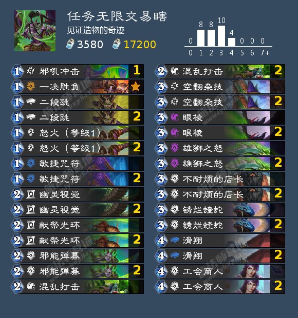 也不怕邪能弹幕打到随从,2工会商人的法强+4会让法术解场非常容易。这样,在这一系列的复杂思路之后,一套完美的无限交易任务瞎,就组出来了——