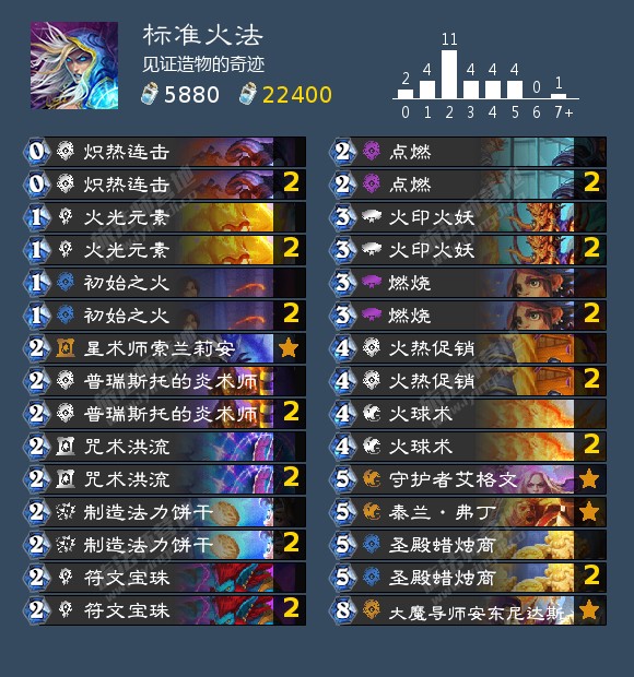 再回来提一下标准的火法。大魔导师安东尼达斯,能被泰兰佛丁检索,作为核心来构筑火法还是可以的。再加入返场非常有效的火印火妖。前期控场,返场,中期炸鸡元素(圣殿蜡烛商)刷牌,然后安东尼一锤定音。