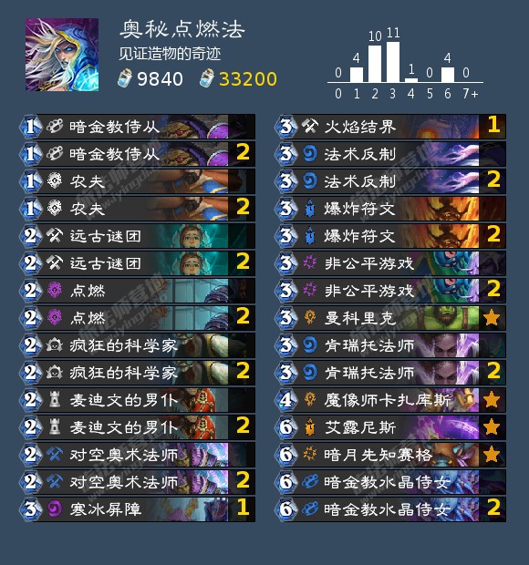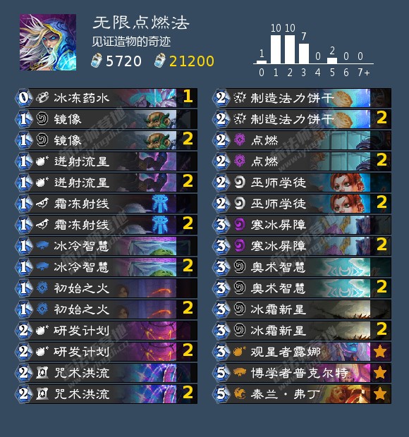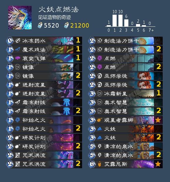 点燃同样适合过牌快的奥秘法。和火妖法同理,带上艾露尼斯进一步增强过牌以搭配点燃,去掉部分直伤,靠点燃作为终结手段,再加入新卡农夫来补充奥秘法一直缺失的1费曲线。(农夫作为一张争议非常大的卡,需要新版本测试后才能知道是否适合奥秘法,现在确实难下定论)。这相当于降低了中期的抢血能力,得到了后期的超高直伤。