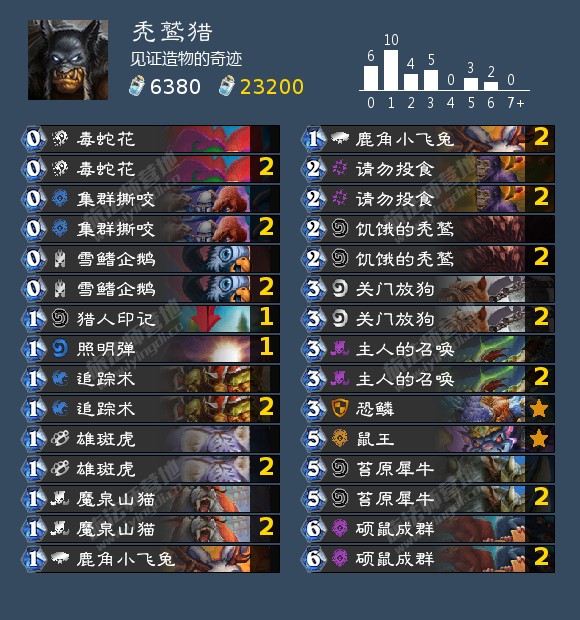 再者就是猎人另一个体系:硕鼠成群和鼠王。原本狂野里就有秃鹫猎,饥饿的秃鹫过牌,请勿投食配合苔原犀牛斩杀的思路。新卡硕鼠成群加强了这个思路。集群撕咬解场+补牌也能让卡组流畅很多。