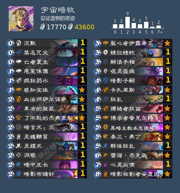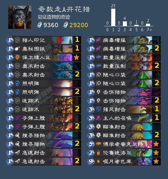 在社区看到的一个很妙的思路(有微调):用主人的召唤检索博学者普克尔特,一旦打出博学者就能稳定抽掉巴库,打出开花弓伦鲁迪洛尔,10张法术不愁打不死人。不过,打出主人的召唤,博学者,抽到巴库时,挂刀的当回合,都很亏节奏。而且奇数猎可能用不到那么多法术就已经能打死对方。
