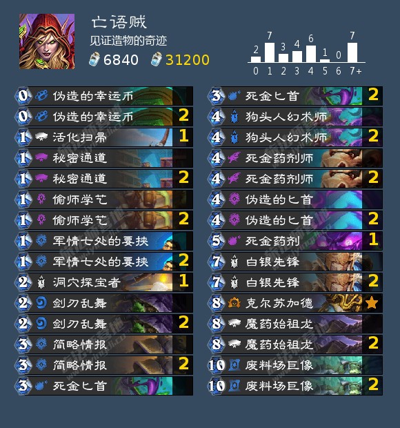 狂野里,很久以前,亡语贼是可玩的,思路就是用狗头人幻术师,拉白银先锋,再拉8费怪如克尔苏加德。新卡简略情报,伪造的匕首,都加强了亡语贼,亡语贼的展开可以变得非常稳定。而且亡语贼有了4把刀之后,就可以带剑刃乱舞来解场,弥补解场能力。这样亡语贼甚至可以优开部分不带变形的快攻卡组。