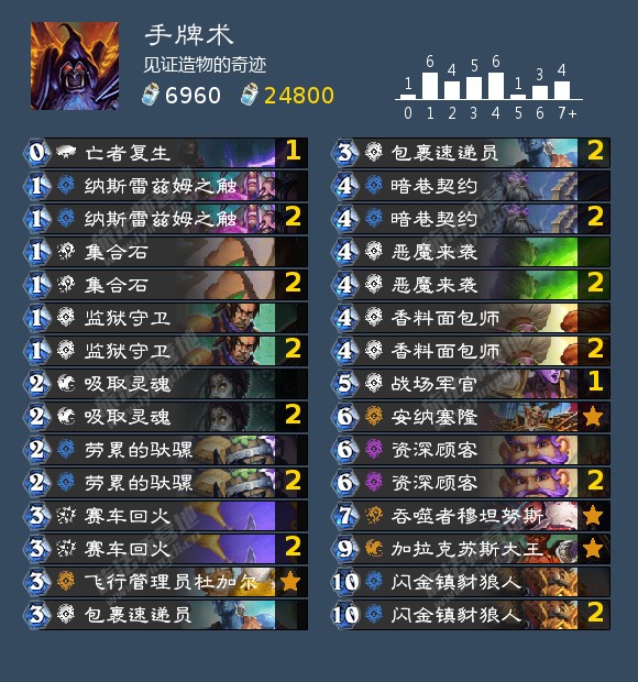 术士还有手牌体系。我的手牌术特点是加入了集结石。术士往往希望1费,或3费用英雄技能时出点东西,但又不想亏掉手牌。所以集结石是个不错的选择,被解了也不会亏,如果对方不解就可以填充两个手牌配合手牌组件。