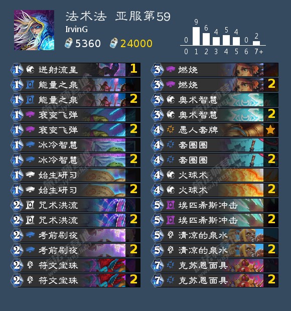法师模板构筑上新辣!!!是的,你没有看错,法术法的模板构筑终于不是5360了。现在环境中,真正意义上的中速卡组其实不多,烈焰风暴的打五多多少少有点浪费,而且7费确实有点高,哪怕开过一次咒术洪流可能都会出现“解了场却依旧拿不回先手”的被动情况。迸射流星是法师效率最高的前期解牌,配合能量之泉以及始生研习中找到的法强怪可以在前中期控制住场面。