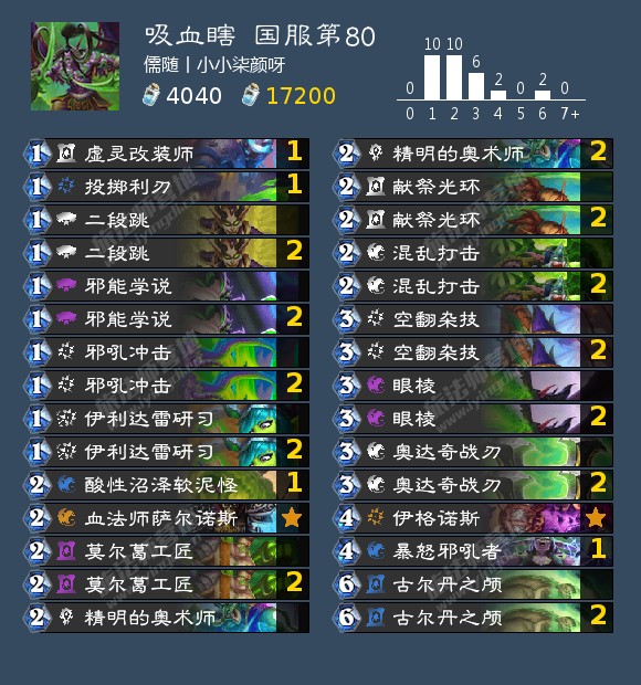 上上周的盘点中,M444认为吸血瞎中空翻杂技与幽灵视觉的构筑抉择并无优劣之分,但我并不同意。空翻杂技可以提高二段跳抽头概率,卡在古尔丹之颅左边时不会卡研习减费,而且中后期或者是被古尔丹之颅减费的话可以过4张找组件,这些都是幽灵视觉不具备的。简言之,空翻党大胜利!