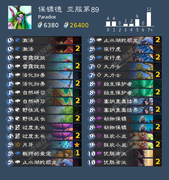 值得一提的是,安娜德对两类DH——吸血瞎和亡语瞎的优势都比较明显,对阵红龙贼与健身战时均可能会因为前期被压制而翻车,但只要科技跳起来或及时铺场,基本都能宣告对局的胜利,牧师,防战和猎人是三大劣势对局,其中前两者需要用丛林之魂赖场再配以树木生长斩杀,对阵猎人……祈祷月蚀和真菌宝藏及时来吧。