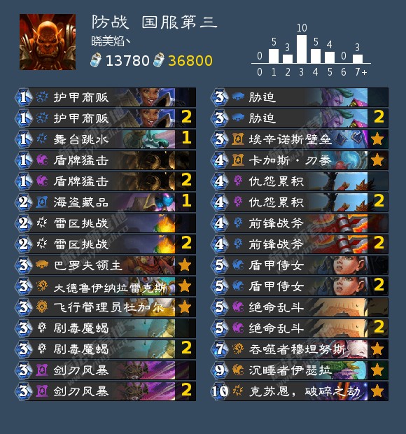 构筑完备的安娜德虽然强度难以与补丁前的牧师相比,但是却接棒牧师成了环境的定义者,几乎以一己之力倒逼整个天梯提速,红龙贼、T7猎等饱受牧师压迫的卡组因为对上安娜德的优势,优先级显著提高。而凭借着过硬的强度、优异的机制以及水准之上的抗快能力,吸血瞎和牧师依旧维持着较高的热度与强度。但是整个补丁最大的受益者却是——防战,随着快攻卡组的抬头,防战的环境好到爆炸,对上吸血瞎、亡语瞎之外的主流卡组几乎都是小优势起步(对于T7猎,晓美焰的说法是虽然打起来很吃力,但是得益于蛋盾在中期的抗伤能力,这个对局里防战的战绩其实很不错),因此也一跃成为了环境中最强、最热门的卡组之一。就好像柒颜说的一样,当冰火战队的各位都开始弃牧从战的时候,防战有多猛可想而知。
