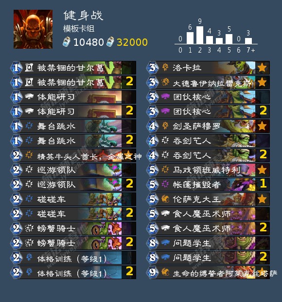 健身战在当前环境中的定位其实相当尴尬,最大的问题就是难以对抗频率很多、展开能力很强的安娜德——如果要对抗安娜德,必须通过巡游领队,洛卡拉等在安娜德返场之前建立起足够的场面优势,而这对过牌较为贫乏的健身战而言有些拼起手。为了提升在这个对局里的胜率,目前主流的健身战构筑都会携带食人魔巫术师,从而打乱安娜德的进攻节奏和展开节奏,更有甚者带上了异教低阶牧师。