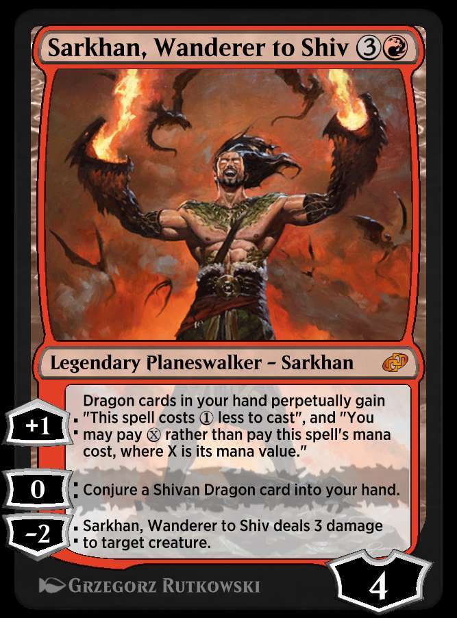 +1:你手中的龙牌永久获得“此咒语减少1施放”和“你可以支付{X}费施放此牌,而不支付此咒语的法术力费用,X为它的法术力值”