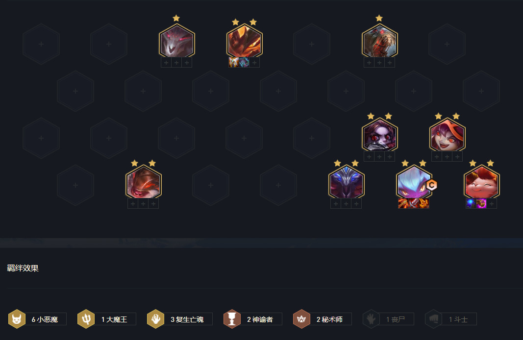 关键羁绊:6小恶魔+2/3复生。阵容主C小炮、提莫,主坦凯南。