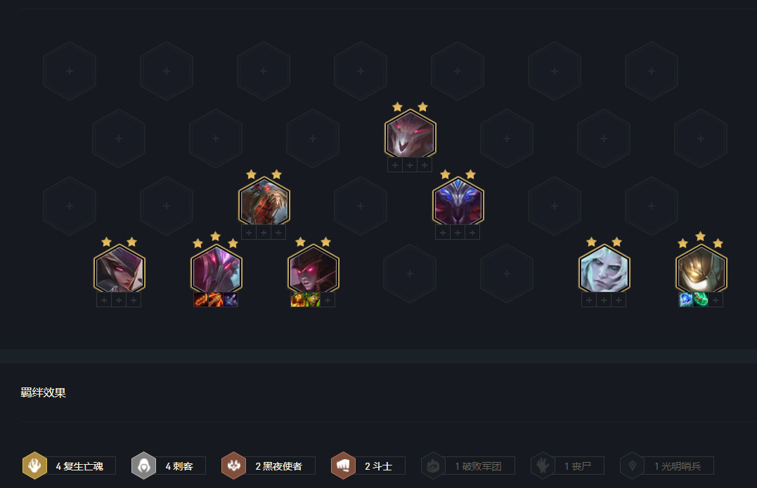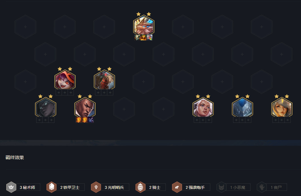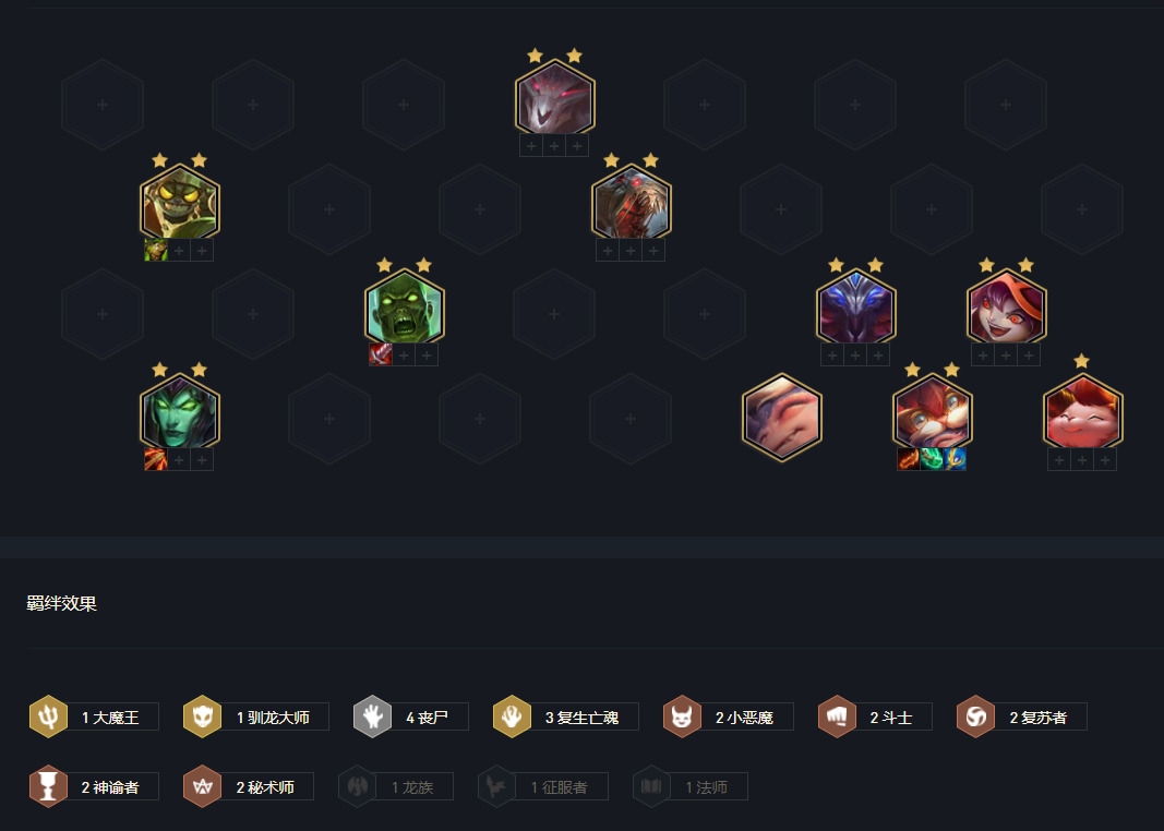 关键羁绊:4/5丧尸+3复生+大头。阵容主C大头,副C与主坦丧尸构造体(塞恩)。