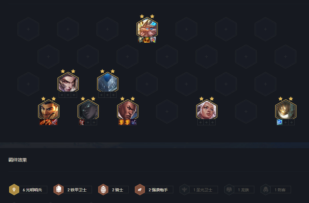 关键羁绊:6圣光。阵容主C大眼、主坦芮尔、副C辛德拉。