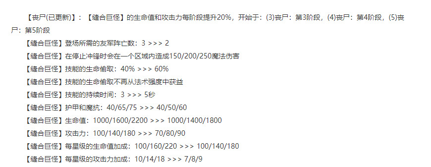 上面是这赛季丧尸的主要更新,对于下面数值只是平衡性更新,更关键的看第一句与第二句,这赛季对局后期丧尸每阶段都会增强20%,这提升让丧尸越往后期越强,只要装备对,大后期就不用更换棋子,会越来越强。且这版本丧尸阵容在死亡2枚棋子后就能召唤丧尸构造体(塞恩),特别在5、6阶段“塞恩”获得极大提升后更是越早出场提升越大,在站位方面,更是建议献祭某一棋子。