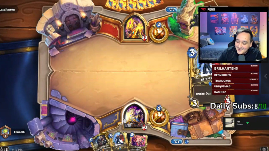 这套卡组是我看试玩的时候一套思路比较新颖的卡组,卡组是围绕艾露恩神谕者和施肥为核心来构筑的,前期有艾露恩神谕者配合钢鬃卫兵然后触发减费,用低费打出吵吵机器人,劳累的驮骡,牙缚德鲁伊这样的嘲讽,因为费用不高而且德有激活雷霆绽放,在铺一波之后可以再打个施肥补牌,看一张实战截图。