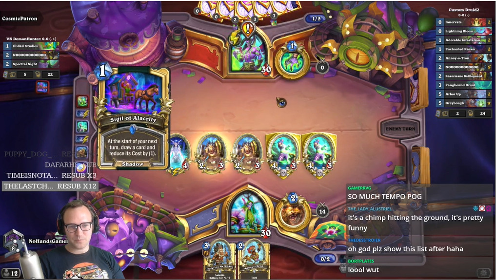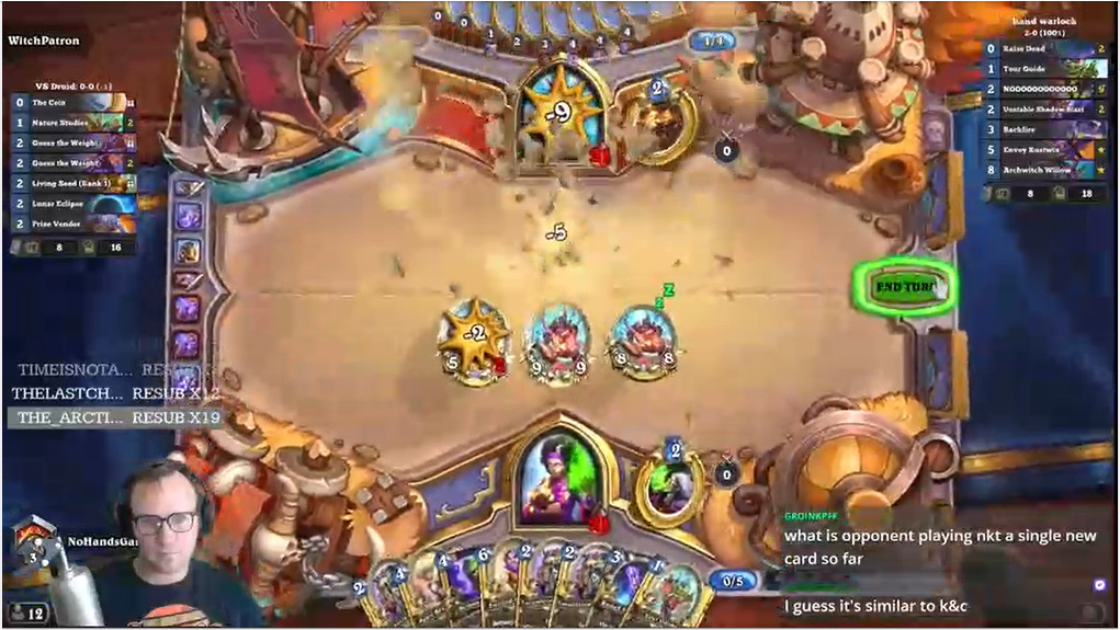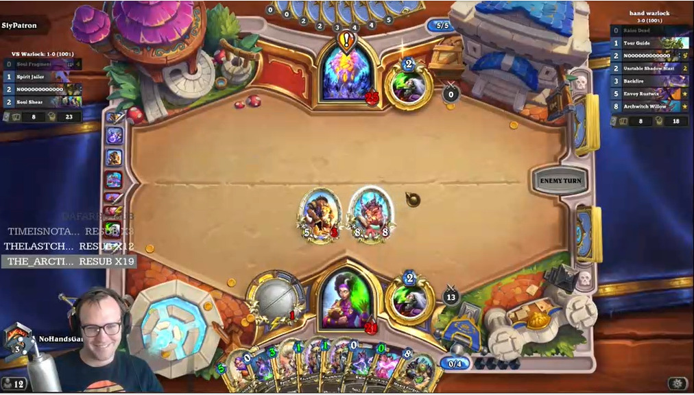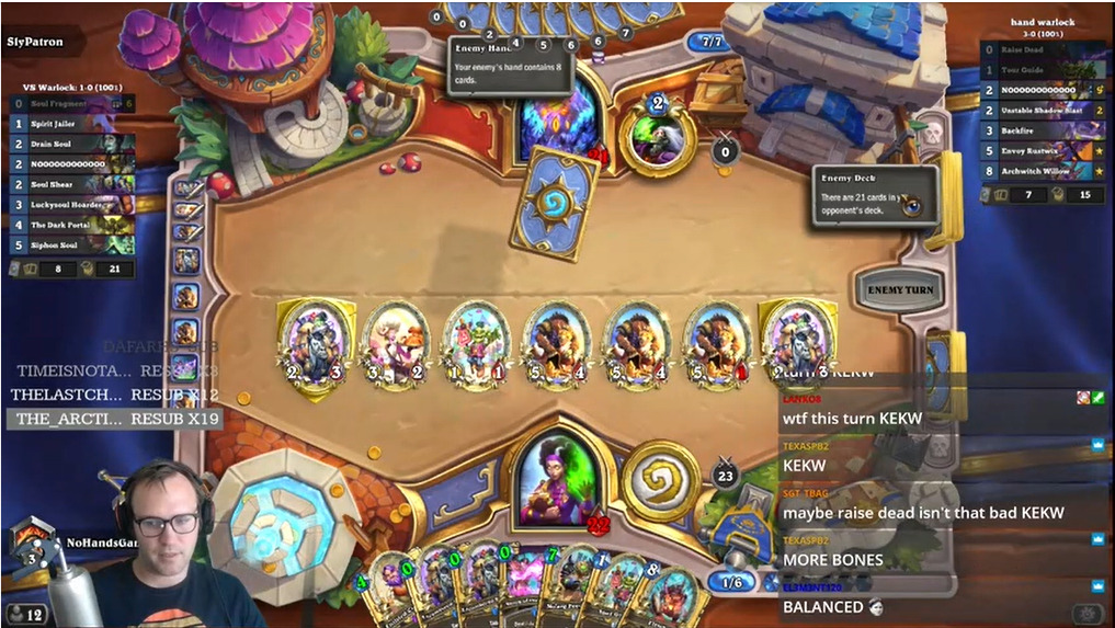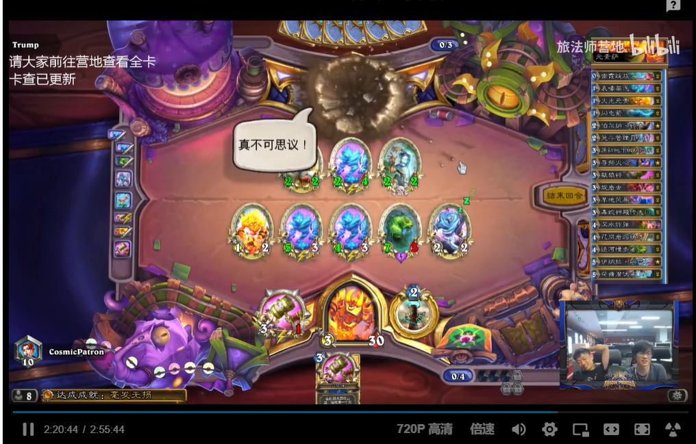 除了有不错的场面展开能力,6费的资深顾客是超级高效的解场牌,中期这张卡基本上是对全场打6-8伤,我感觉这张牌对于一个手牌术来说就是大多数时候都能全清场面。香料面包师不多说,回血非常高效的单卡,这两张可以说是术士最强的防守手段。术士还有个体系试玩的时候我也觉得很厉害,我甚至感觉可能会削弱符文秘银杖,因为这张卡配合赛车回火能直接完成,一手牌的术士手牌费用全部减一,太可怕了,这种很容易完成的大范围减费的卡(还能减两次)都挺危险的。(因为这个减费的上限,NoHandsGamer还带了女巫维洛这一套,6费出个维洛拉出来二个莫尔葛熔魔,对面直接傻眼)。接下来放几个实战视频供大家参考。