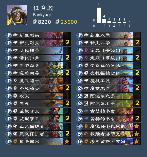 第二点我们觉得骑士的卡组应该就是压低曲线,以快速做完任务为主旨,越快做完优势越大,卡组曲线得带的很低。给大家看一些任务骑的构筑做个参考。