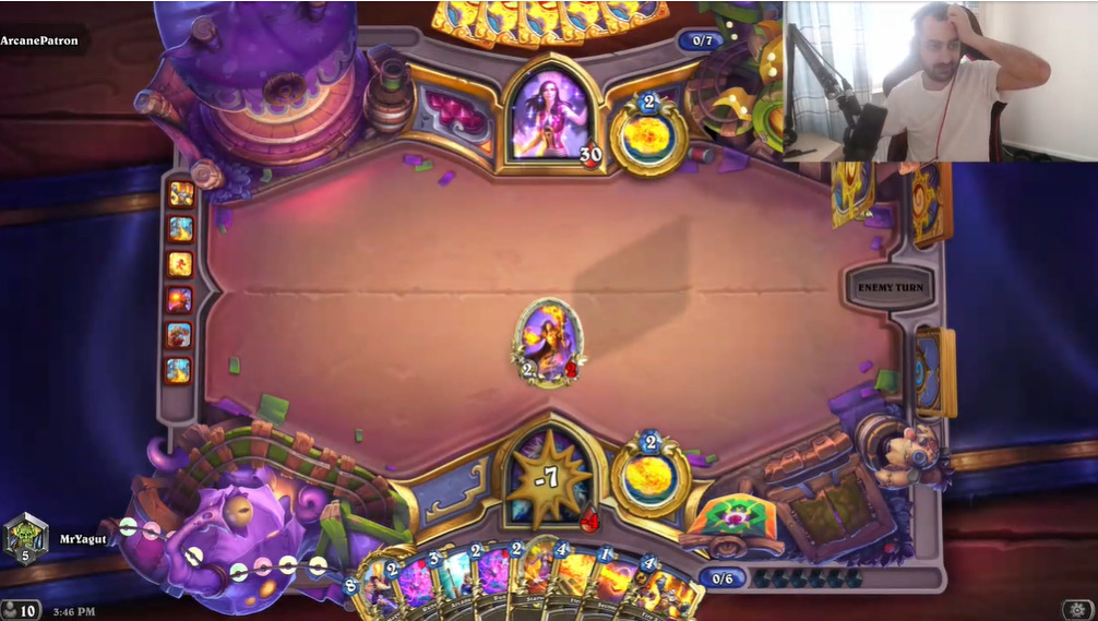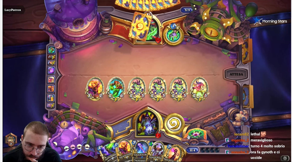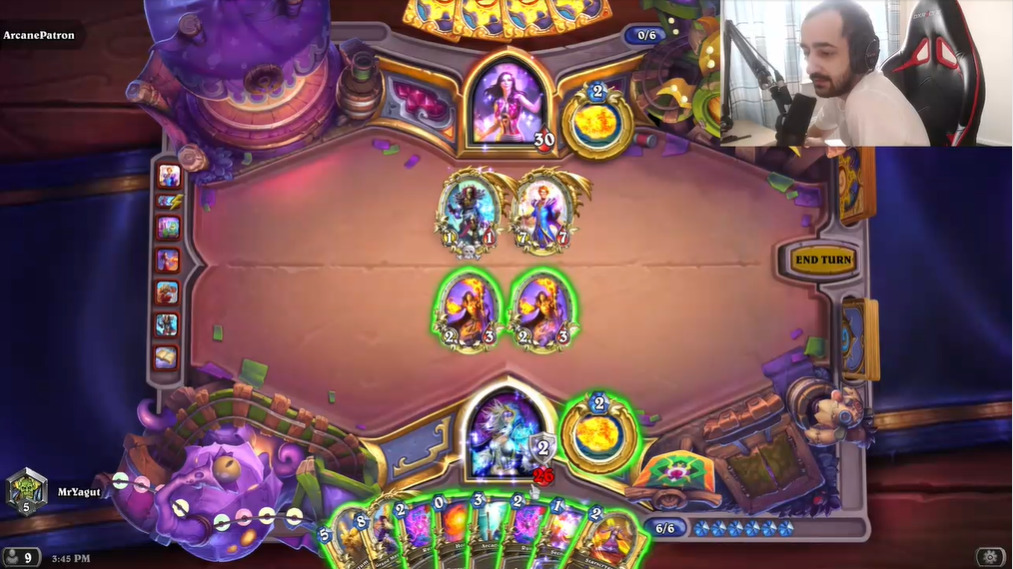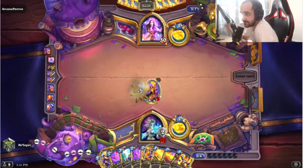 结果到了第二天试玩,一切都变了,我们最开始遇到了外服的特级大师Leta,被他用一套5费做完任务的术士卡组打傻了,从那开始这套疯狂的,极具术士玩法魅力的卡组开始疯狂流传,不仅我和弹幕姬加入了连着还排到了好多这套卡组,先给大家看看我们被吊打的对局。