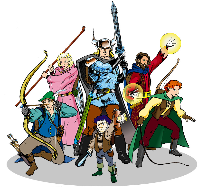 我和龙与地下城这个游戏的互动就是从这里开始的。我在初中和高中时期都玩得很热衷、大学时期少了一点,然后住在洛杉矶时都会和我的朋友进行每周的战役。下面这张队伍图就是我的室友Chris画的。(Chris要我强调这张图是他很年轻时画的。)我是右边双手发亮的法师。