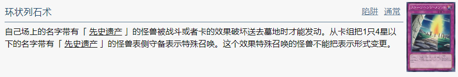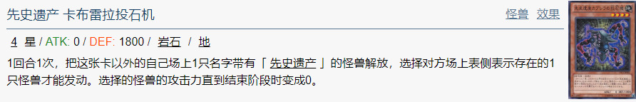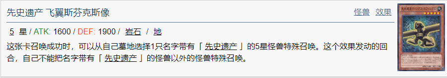 这张卡召唤成功时,可以从自己墓地选择1只名字带有「 先史遗产 」的5星怪兽特殊召唤。这个效果发动的回合,自己不能把名字带有「 先史遗产 」的怪兽以外的怪兽特殊召唤。