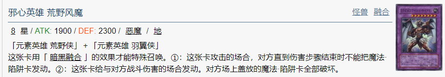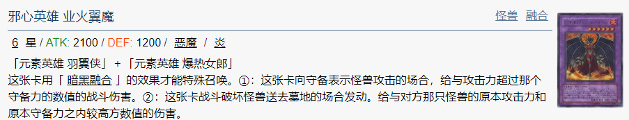 技能描述:自己场上的邪心英雄融合怪兽的攻击力提升为自己墓地邪心英雄怪兽和元素英雄怪兽数量×100点。