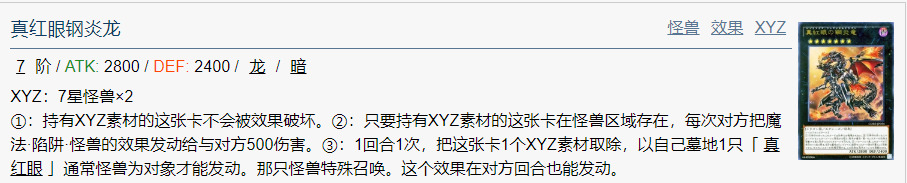 ①:持有XYZ素材的这张卡不会被效果破坏。②:只要持有XYZ素材的这张卡在怪兽区域存在,每次对方把魔法·陷阱·怪兽的效果发动给与对方250伤害。③:1回合1次,把这张卡1个XYZ素材取除,以自己墓地1只「 真红眼 」通常怪兽为对象才能发动。那只怪兽特殊召唤。这个效果在对方回合也能发动。