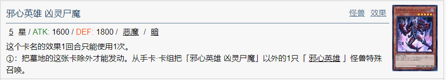 技能描述:1回合1次,可以舍弃手牌1张邪心英雄怪兽使用,将1张“暗黑融合”或“暗黑神照”从卡组加入手牌,或将卡组外的1张“邪心英雄 凶灵尸魔”放入墓地,这个技能,只能加1次手卡“邪心英雄 凶灵尸魔”只能放入墓地1次。