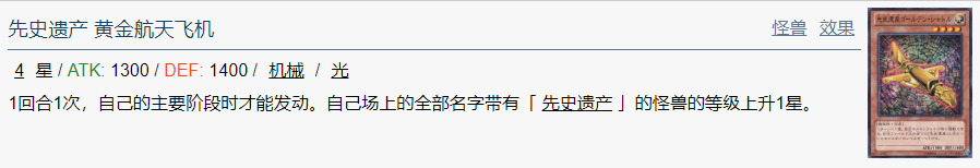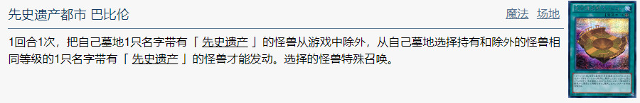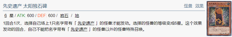 1回合1次,选择自己场上1只名字带有「 先史遗产 」的怪兽才能发动。选择的怪兽的等级变成6星。这个效果发动的回合,自己不能把名字带有「 先史遗产 」的怪兽以外的怪兽特殊召唤。