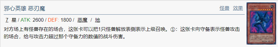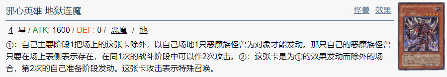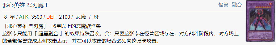 技能描述:在决斗开始时,将2张“邪心英雄 恶刃魔”和1张“暗黑融合”加入你的卡组,将1张“邪心英雄 恶刃魔王”加入你的额外卡组