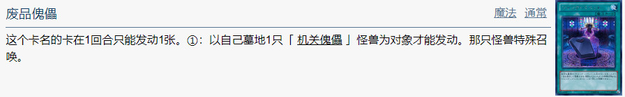 这个卡名的卡在1回合只能发动1张。①:以自己墓地1只「 机关傀儡 」怪兽为对象才能发动。那只怪兽特殊召唤。