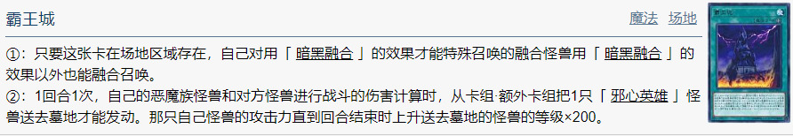 技能描述:在自己场上不存在魔法卡的情况下,将手牌的1张“融合”魔法卡或其他“融合”魔法卡1张给对方看并使用。从牌组外把“霸王城”放到自己场上。这个技能一辈子只能使用一次。