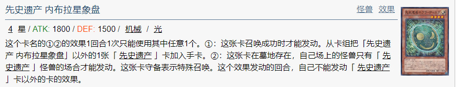 这个卡名的①②的效果1回合1次只能使用其中任意1个。①:这张卡召唤成功时才能发动。从卡组把「先史遗产 内布拉星象盘」以外的1张「 先史遗产 」卡加入手卡。②:这张卡在墓地存在,自己场上的怪兽只有「 先史遗产 」怪兽的场合才能发动。这张卡守备表示特殊召唤。这个效果发动的回合,自己不能发动「 先史遗产 」卡以外的卡的效果。