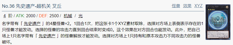 名字带有「 先史遗产 」的4星怪兽×2。1回合1次,把这张卡1个XYZ素材取除,选择对方场上表侧表示存在的1只怪兽才能发动。选择的怪兽的攻击力直到回合结束时变成0。这个效果在对方回合也能发动。此外,把自己场上1只名字带有「 先史遗产 」的怪兽解放才能发动。选择对方场上1只持有和原本攻击力不同攻击力的怪兽破坏。