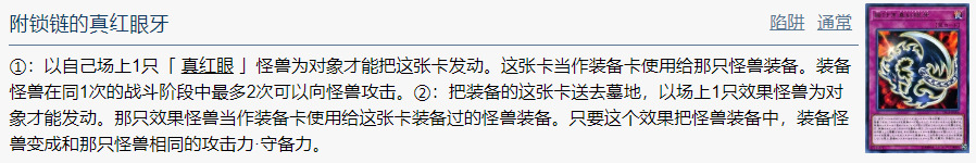 ①:以自己场上1只「 真红眼 」怪兽为对象才能把这张卡发动。这张卡当作装备卡使用给那只怪兽装备。装备怪兽在同1次的战斗阶段中最多2次可以向怪兽攻击。②:把装备的这张卡送去墓地,以场上1只效果怪兽为对象才能发动。那只效果怪兽当作装备卡使用给这张卡装备过的怪兽装备。只要这个效果把怪兽装备中,装备怪兽变成和那只怪兽相同的攻击力·守备力。