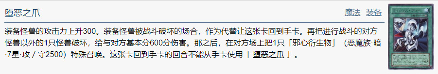 装备怪兽的攻击力上升300。装备怪兽被战斗破坏的场合,作为代替让这张卡回到手卡。再把进行战斗的对方怪兽以外的1只怪兽破坏,给与对方基本分600分伤害。那之后,在对方场上把1只「邪心衍生物」(恶魔族·暗·7星·攻/守2500)特殊召唤。这张卡回到手卡的回合不能从手卡使用「 堕恶之爪 」。