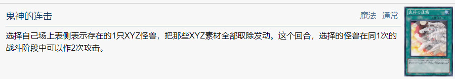 选择自己场上表侧表示存在的1只XYZ怪兽,把那些XYZ素材全部取除发动。这个回合,选择的怪兽在同1次的战斗阶段中可以作2次攻击。