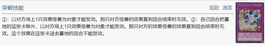 ①:以对方场上1只效果怪兽为对象才能发动。那只对方怪兽的效果直到回合结束时无效。②:自己回合把墓地的这张卡除外,以对方场上1只效果怪兽为对象才能发动。那只对方的效果怪兽的效果直到回合结束时无效。这个效果在这张卡送去墓地的回合不能发动。