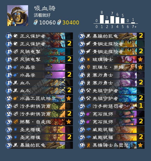 ps:起手留水晶学和污手党,然后就是buff和卖血,然后用吸血随从恢复。配合坎格尔回血翻倍。血爪和乌龟都是卖血卡,威能祝福也是,给对手随从贴身,血就可以哗啦啦地掉了,带着武器时自己也可以直接撞上去卖血。