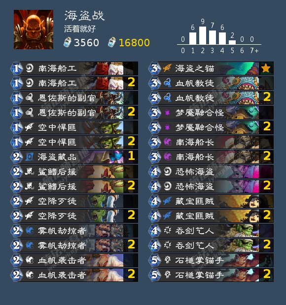 起手找低费海盗和海盗之锚。用武器和大海盗解场,用1攻的海盗给对手英雄刮痧,这样次数可以更多。因此多用鲨鳍后援召唤的1攻海盗,这样刮痧才带劲。