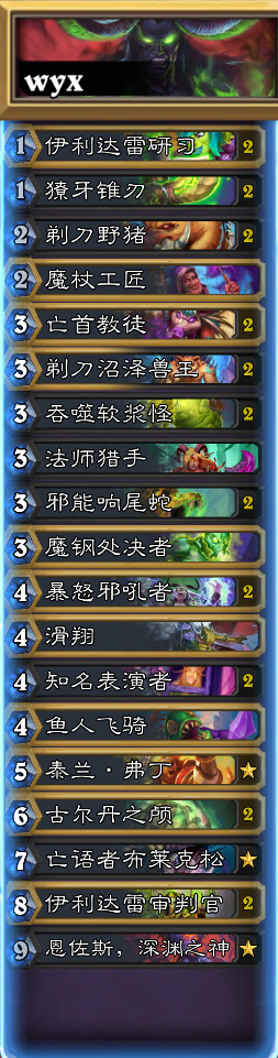 起手留牌:1费刀、魔杖工匠、两种套娃、左一头,有剃刀野猪留3,有沼泽兽王酌情留4,魔钢和444同时出现可同时留,左1滑翔一般不留,需要的时候再说,其他手牌好可以留布莱克松,总而言之为前期节奏服务。