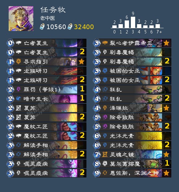 这张任务能让控制牧多一个后期的制胜手段(就像手里的死亡之翼一样,只要有他在终究会有希望)而且中间的奖励可以让你发现一张牌,老中医给了牧师任务非常高的评价,认为这是一张非常契合牧师的牌。